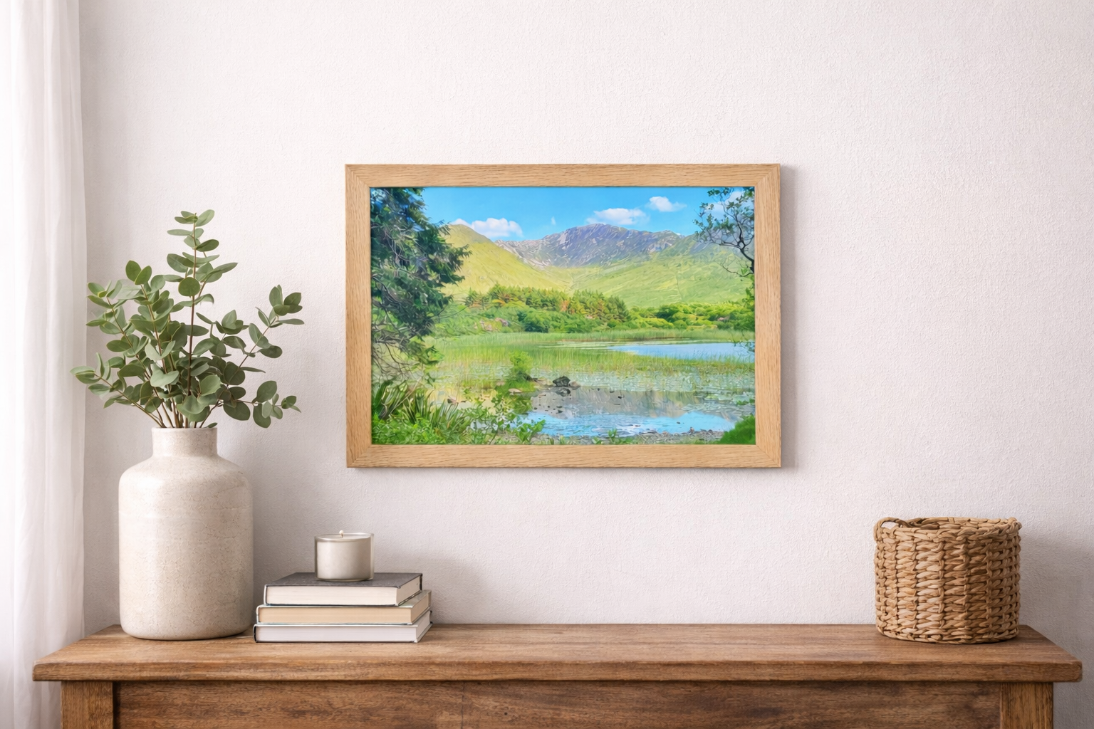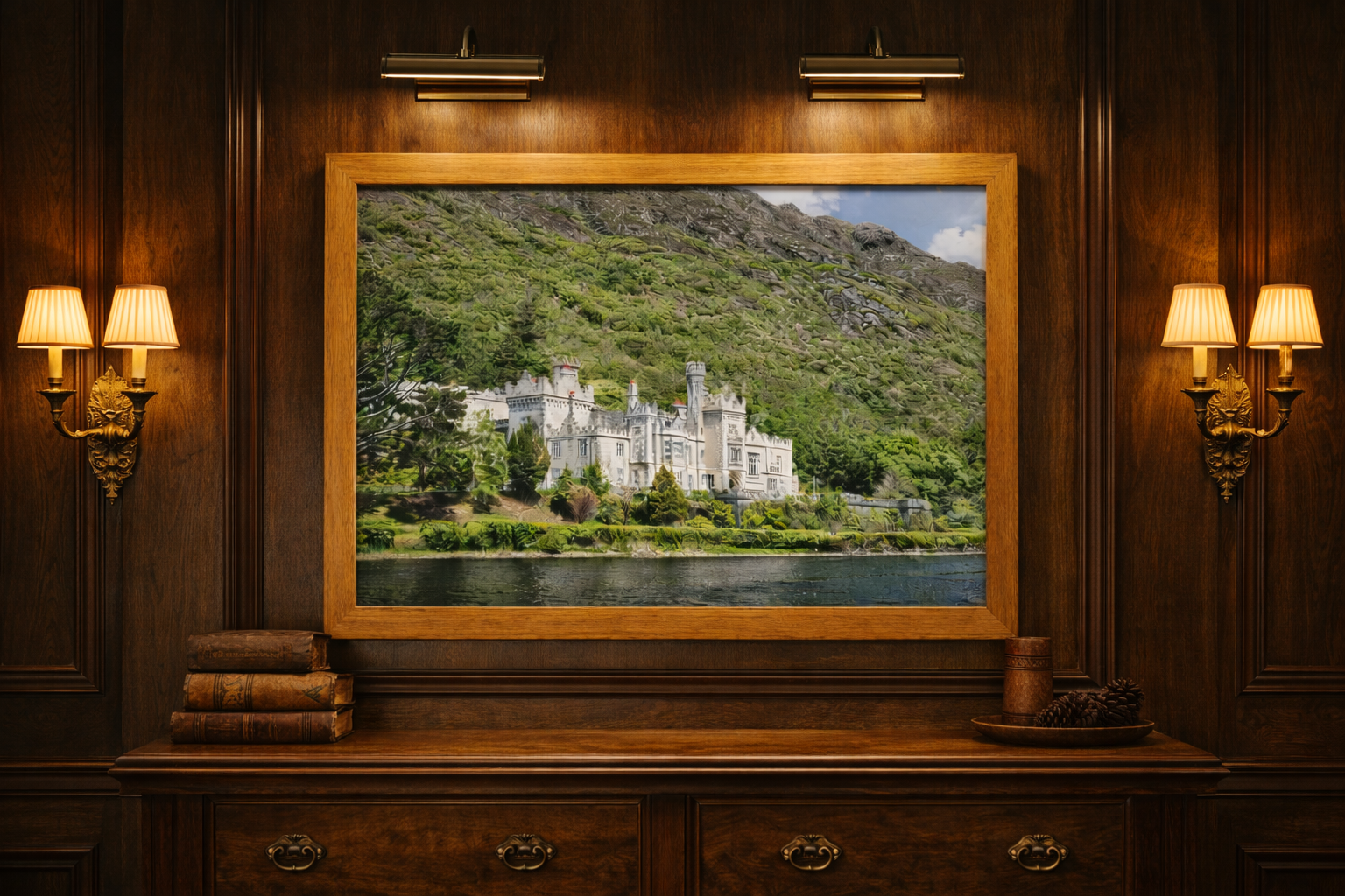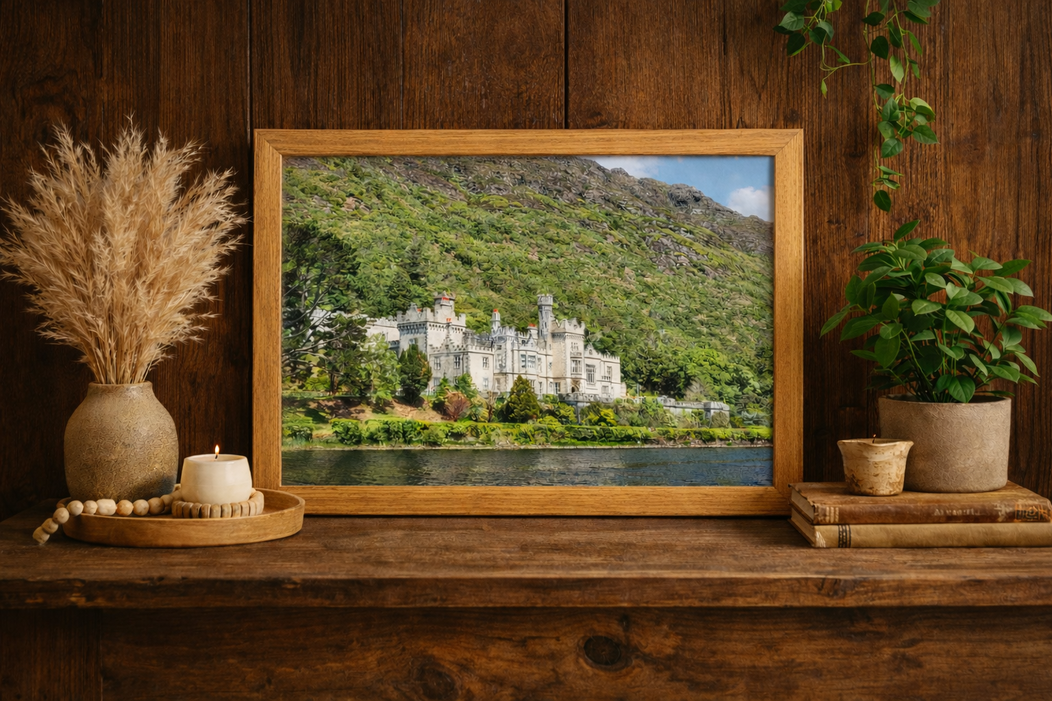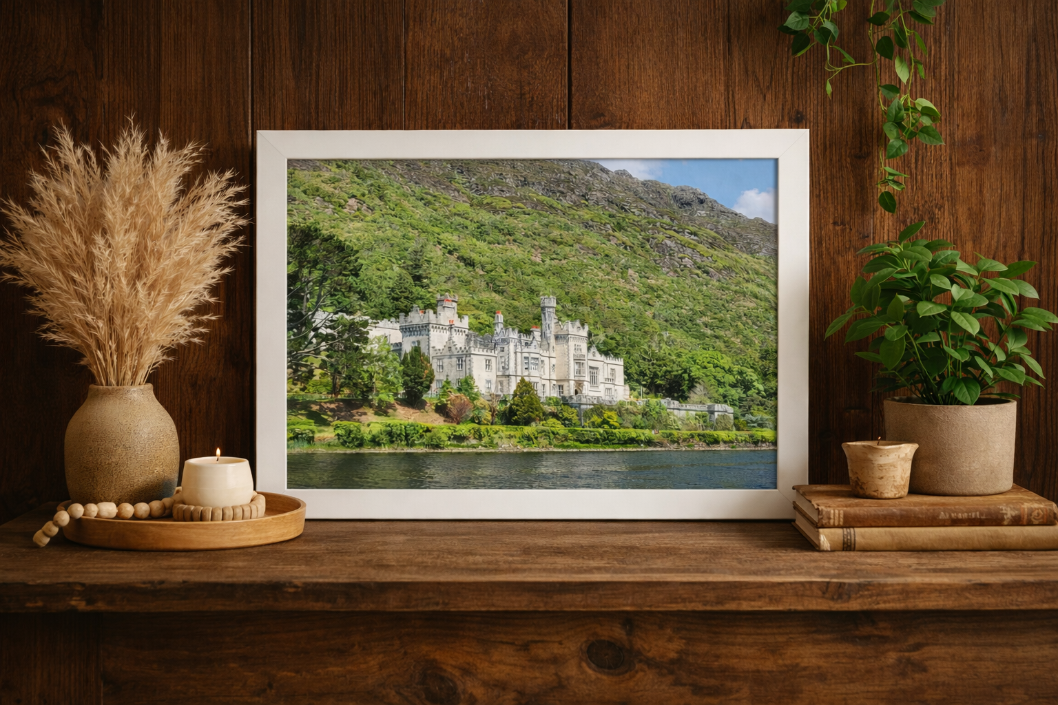 Bring a sense of quiet beauty and Irish heritage into your space with this framed landscape print featuring Kylemore Abbey, nestled between lush green hills and reflective waters.